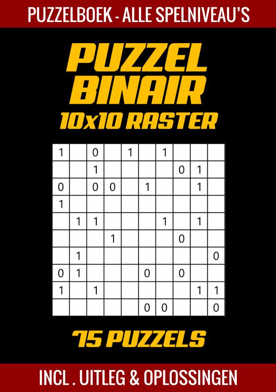 Binair puzzelboek met 75 puzzels van makkelijk tot moeilijk. Inclusief uitleg en oplossingen. Deze puzzel, die ook bekend staat onder de naam Binaire puzzel en Binairo, los je op met logisch redeneren. Het doel is om nullen en enen volgens bepaalde regels in een 10×10 raster te plaatsen. Een superleuke puzzel die zorgt voor urenlang puzzelplezier! Details: paperback A5 formaat met twee puzzels per pagina, totaal 48 pagina’s, zwart/wit.