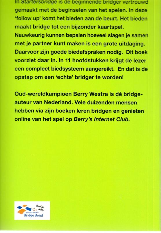 In het boek Startersbridge (isbn978-94-91092-00-8) is de beginnende bridger vertrouwd gemaakt met de beginselen van het spelen. In deze ‘follow up’ komt het bieden aan de beurt. Het bieden maakt bridge tot een bijzonder kaartspel. Nauwkeurig kunnen bepalen hoeveel slagen je samen met je partner kunt maken is een enorme uitdaging. Daarvoor zijn goede biedafspraken nodig. Dit boek voorziet daarin. In 11 hoofdstukken krijgt de lezer een compleet biedsysteem aangereikt. En dat is de opstap om een ‘echte’ bridger te worden.
