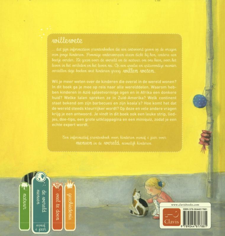 Overal in de wereld vind je kinderen. Elk kind heeft zijn eigen huidskleur, zijn taal en zijn gewoonten. Dat heeft te maken met je ouders en met het werelddeel waarin je woont. Wat doen kinderen in Afrika overdag? Eten kinderen overal met mes en vork? Zijn alle neuzen over de hele wereld dezelfde? Met welke dieren spelen kinderen uit Oceanië? En welke sport beoefenen ze in Noord-Amerika? Je vindt in dit boek ook een grappig stripverhaal, leuke opdrachten, een grote uitklappagina en een miniquiz, zodat je een echte expert wordt. Een informatief prentenboek in de serie Willewete voor kinderen vanaf 4 jaar, over kinderen in de wereld.